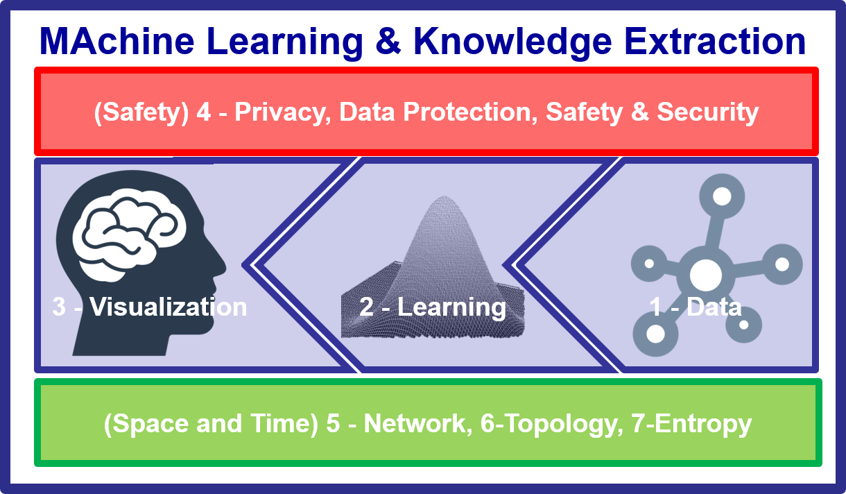 Papers are sought from the following seven topical areas (see image below) fostering an integrated machine learning approach. For an overview refer to the inaugural paper of the new Machine Learning & Knowledge Extraction (MAKE) journal: